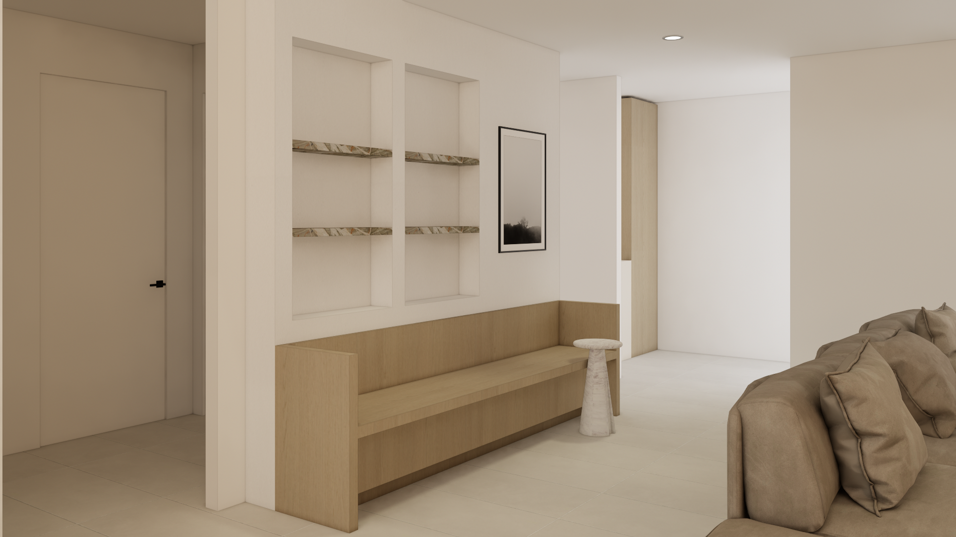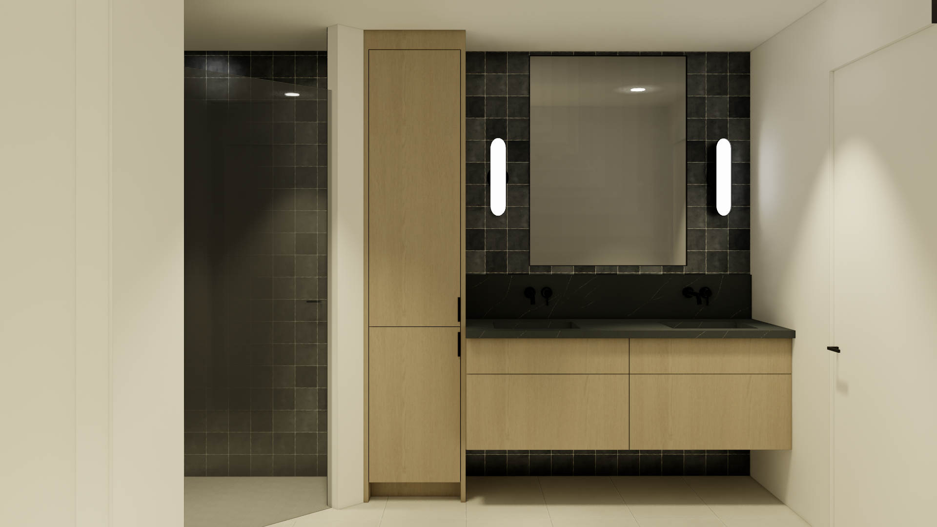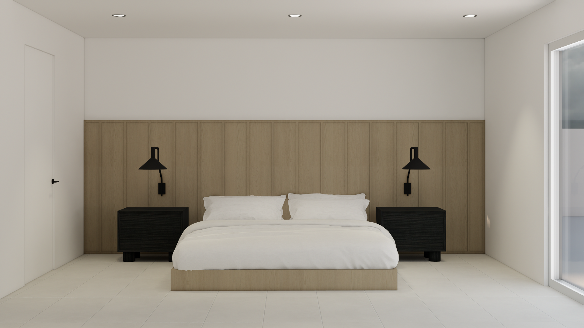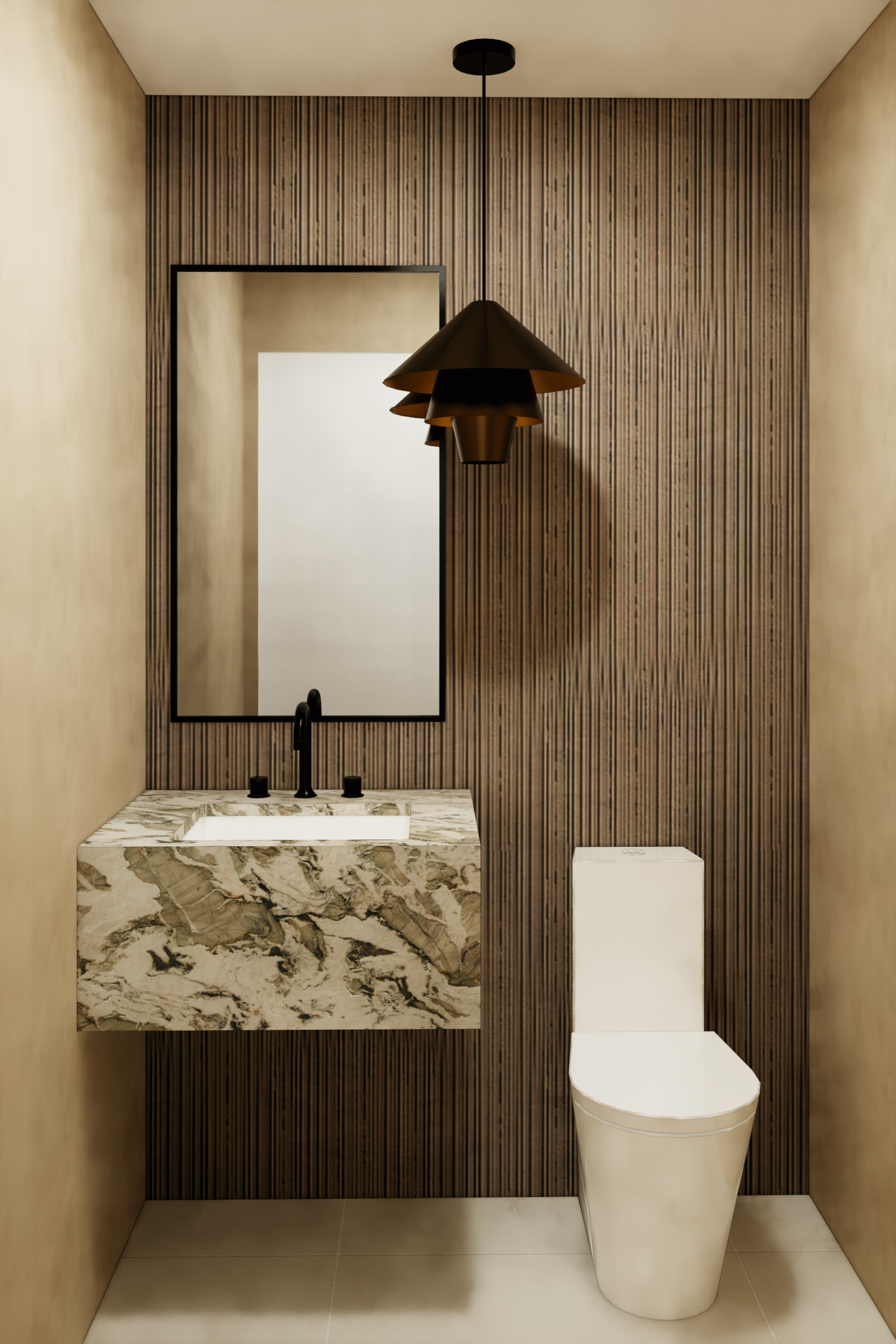 The kitchen and living areas feature integrated storage, minimalist finishes, and premium materials throughout. In the primary suite, vertical paneling and sculptural lighting add tailored sophistication, while the dramatic powder room makes a bold statement with veined stone and slatted wood detailing.